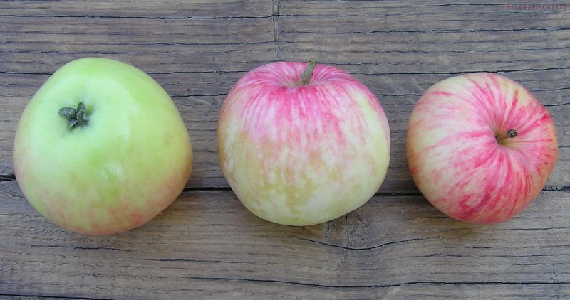 Плоды созревают в начале лета, имеют небольшие размеры, сильноуплощенные, слаборебристые. Кожица гладкая, основная окраска желтовато-зеленая, белеющая при созревании, с легким румянцем и розовыми полосами и крапинками. Подкожные точки многочисленные, беловатые. Плодоножка короткая, средней толщины или толстая. Воронка глубокая, широкая, без оржавленности. Блюдце мелкое, широкое. В основании чашелистиков часто видны вздутые бугорки ("перлы"). Чашечка закрытая. Сердечко репчатое. Семенные камеры закрытые. Семена средней величины, светло-каштанового цвета. Мякоть плодов белая с желтоватым оттенком, иногда розовая под кожицей, рыхлая, сочная, нежная, ароматная, кисло-сладкого вкуса, часто с преобладанием кислоты. Химический состав плодов: сумма сахаров – 9,2%, титруемых кислот – 0,89%, аскорбиновой кислоты – 9,3 мг/100г, Р-активных веществ – 129 мг/100г. Потребительский период продолжается 2-3 недели. Из-за неодновременного созревания на дереве плоды часто осыпаются. Плоды не пригодны для длительных перевозок. Основное назначение плодов – потребление в свежем виде, также могут быть использованы для приготовления соков.